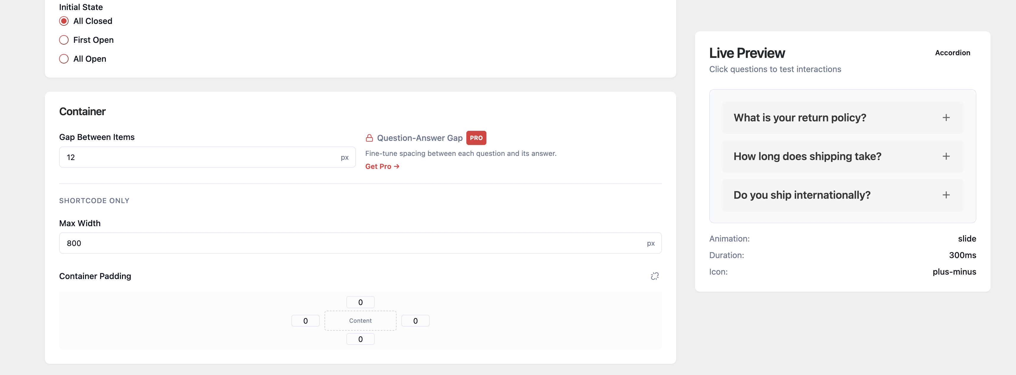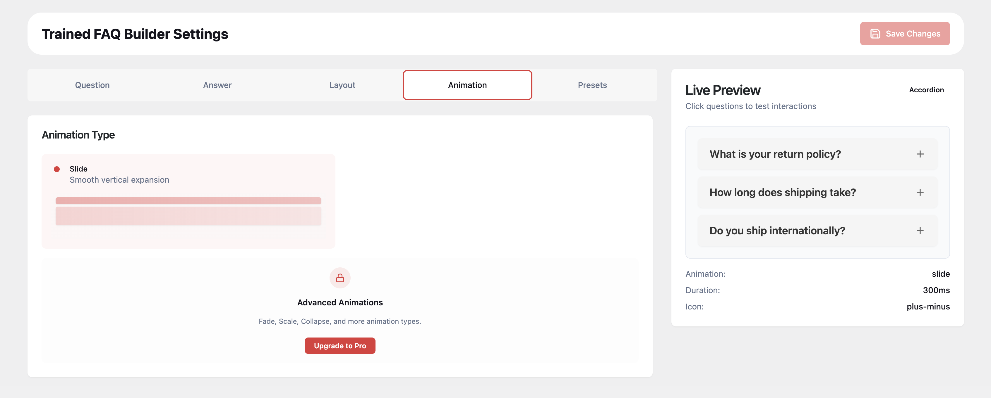 • Control FAQ motion behavior: Lite includes smooth slide animation, while PRO unlocks additional animation types for richer interactions.