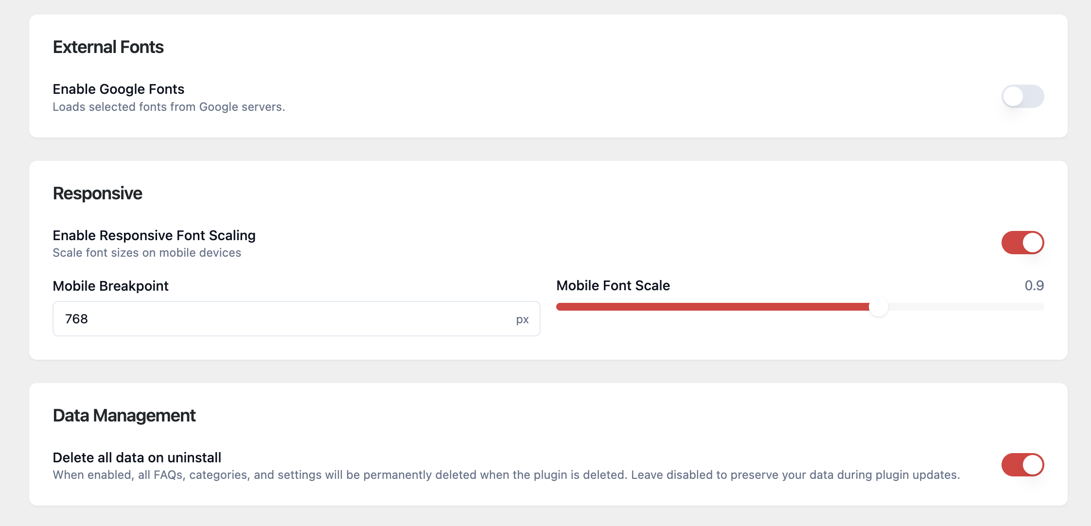 • Improve mobile readability and site hygiene: enable responsive font scaling, set mobile breakpoints, and choose uninstall data cleanup behavior.