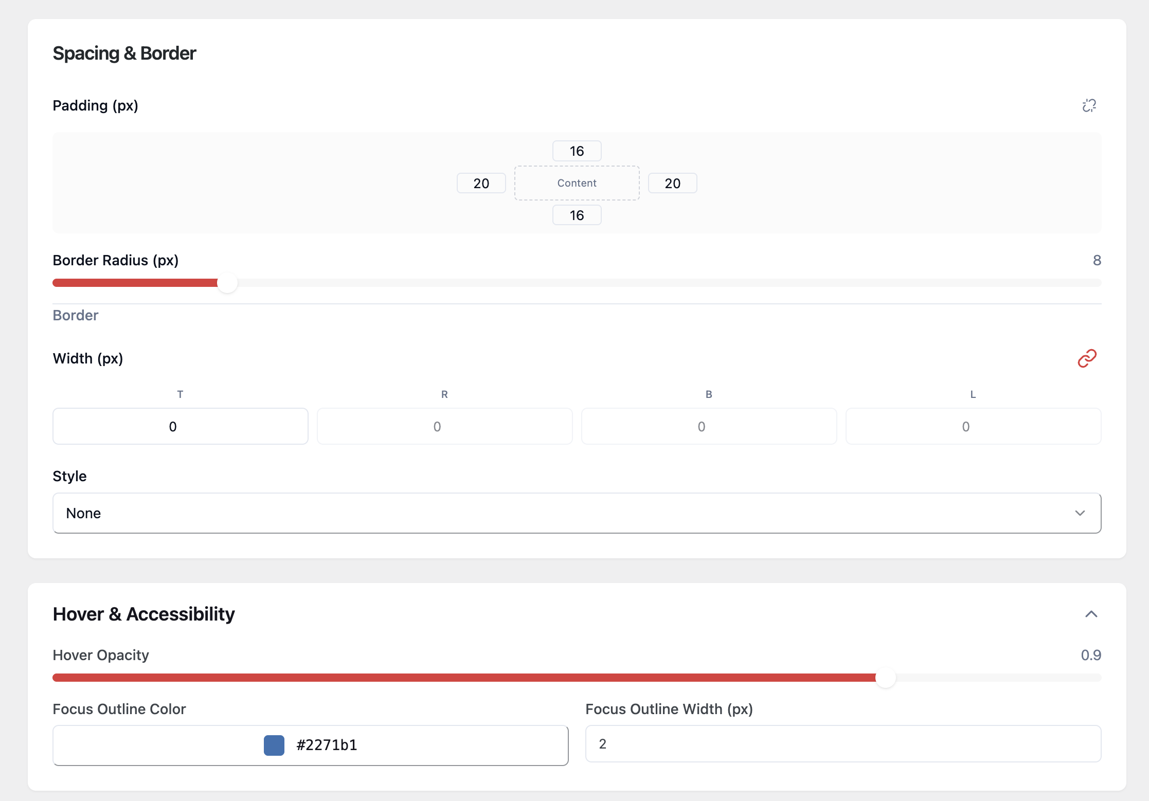 • Fine-tune UX and accessibility details: adjust padding, borders, hover opacity, and focus outline settings for cleaner, more accessible FAQ blocks.